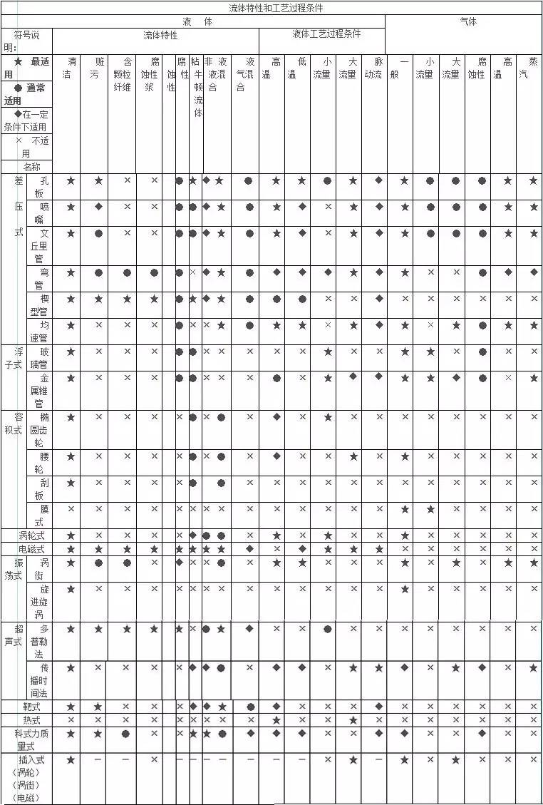 表1???流量計(jì)流體特性和工藝過程條件選型一覽表