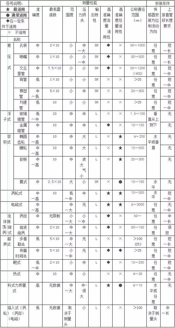 表2???流量計(jì)測(cè)量性能、安裝條件選型一覽表