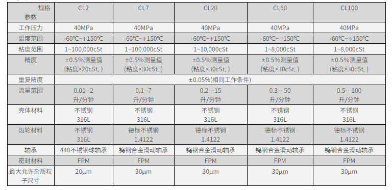 ? ? ?? 針對各種應(yīng)用,借助不同的間隙、不同的軸承類型及不同材料,CL 系列齒輪式流量計(jì)可實(shí)現(xiàn)不同介質(zhì)的測量。