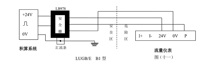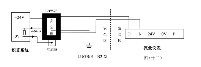 LUGB/E三線制脈沖輸出型渦街流量儀表與LB978齊納安全柵相連、LUGB/E兩線制標準4~20mA電流輸出型渦街流量儀表與LB987S齊納安全柵相連可構(gòu)成本質(zhì)安全型防爆系統(tǒng),產(chǎn)品防爆標志為Ex ia Ⅱ CT2-T5。本安防爆型渦街流量傳感器/變送器與防爆安全柵和積算系統(tǒng)等關(guān)聯(lián)設備的接線性請參看防爆安全柵廠家提供的接線說明和以下所示圖(十一),圖(十二)。