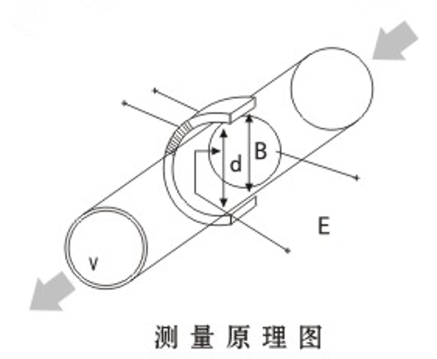 測量流量時(shí),導(dǎo)電性液體以流速V流過垂直干流動(dòng)方向的磁場,導(dǎo)電性液體的流動(dòng)感應(yīng)出一個(gè)與平均流速成正比的電壓,其感應(yīng)電壓信號(hào)通過與液體直接接觸的電極檢出。對于同一流量計(jì)S. B. d為常量,所以流量與感應(yīng)電動(dòng)勢E(或流速V)的大小成正比。