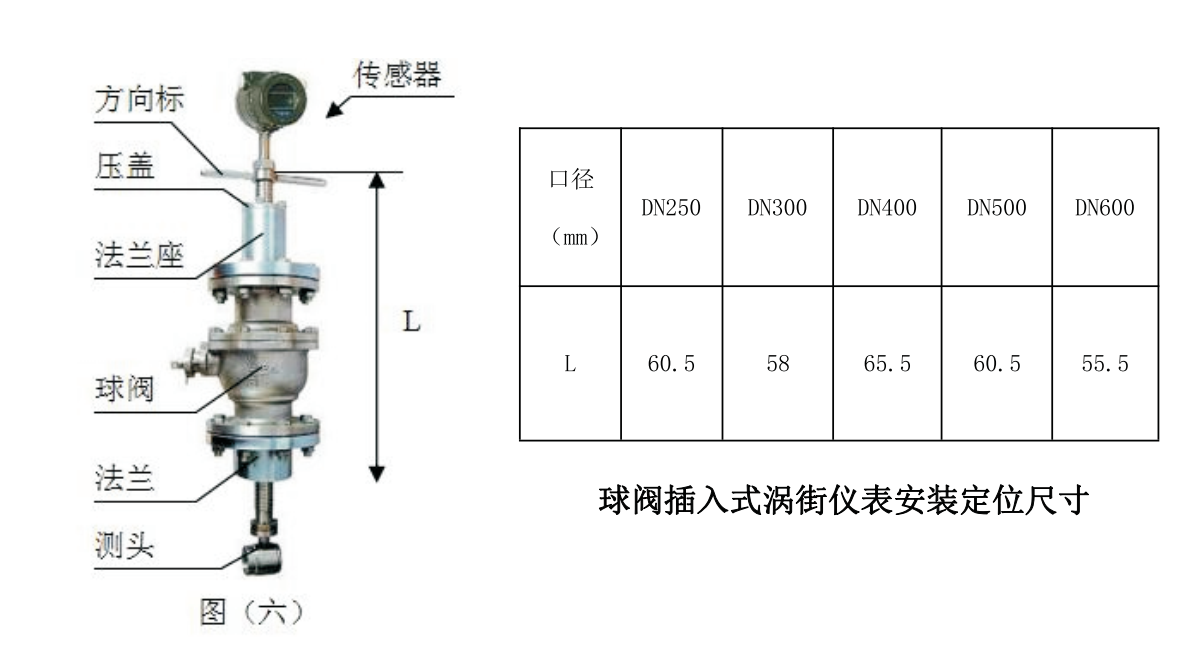 2.3將DN50球閥安裝到安裝底座上。注意球閥的長空腔向上,檢査球閥是否能全開全關(guān)。如有問題應(yīng)進(jìn)行修理將壓緊螺紋座、壓緊螺母和橡膠密封圈安裝 到球閥上。松開定位螺釘和壓緊螺母,將傳感器插入桿通過球閥插入被測管道。插入 深度由H4計(jì)算,并由游標(biāo)卡尺或鋼卷尺測量,符合要求后,上緊壓緊螺母和定位螺 釘,同時(shí)應(yīng)注意傳感器方向標(biāo)志桿指向應(yīng)和流體流向一致